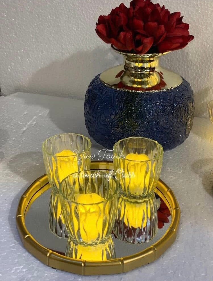 Bring charm and elegance into your home with this 3-piece glass candle holder set, beautifully arranged on a golden mirror tray. Each holder features a modern wavy glass design that reflects candlelight gracefully, creating a warm, luxurious glow.